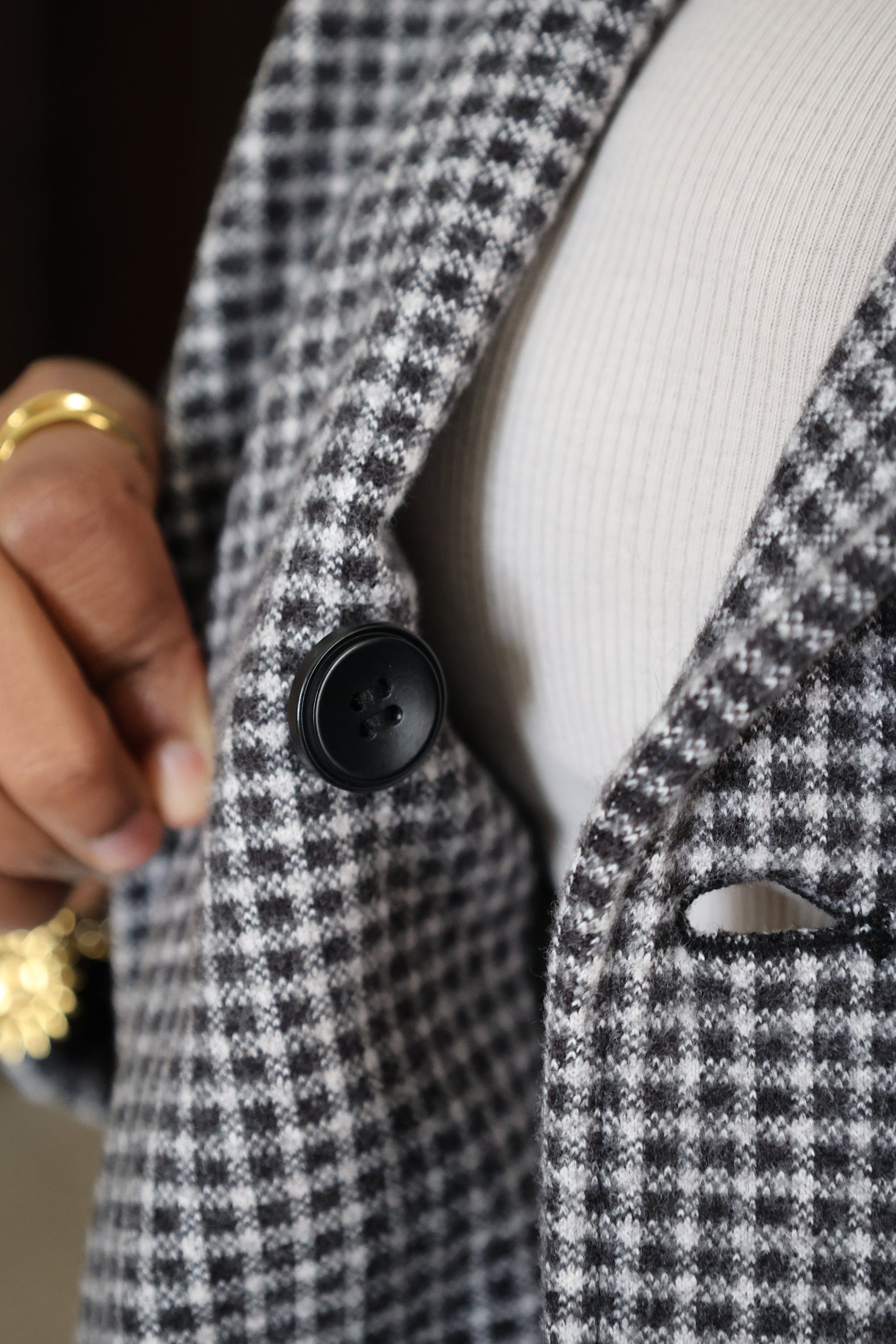This jacket embodies quiet confidence and timeless elegance. Its long, tailored silhouette creates a commanding yet graceful presence, while the structured shoulders and double-breasted design lend a sense of strength and intention. The subtle check pattern adds depth and texture, offering visual interest without overwhelming the look.